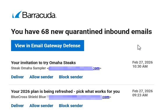 Barracuda is a tool used by the IT team to provide email security. Users will receive email notifications of quarantined emails. Users can take action on these emails as instructed below. Blocked emails do not fall into the quarantined category. Blocked emails must still be reported via an IT ticket.